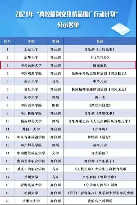 日前,教育部网站对2021年度高校思想政治工作有关培育建设项目结果进行公示,20个项目入选2021年“高校原创文化精品推广行动计划”,中央民族大学民族舞剧《情深谊长》成功入选。