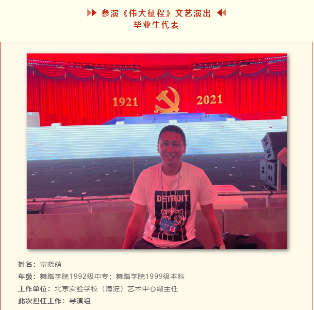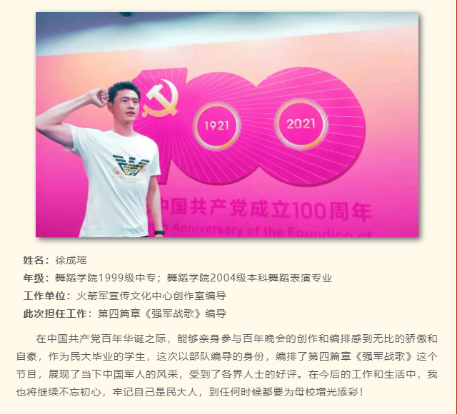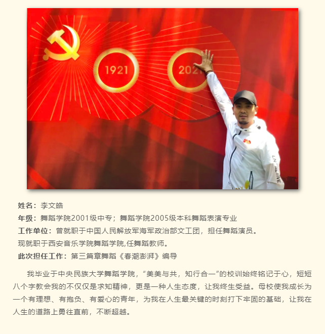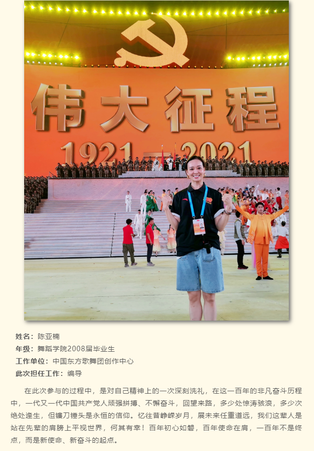 今年有幸受邀参与了庆祝中国共产党成立100周年文艺演出《伟大征程》的节目编创,能够有机会在这样重大的演出中贡献力量是我一生的荣光。通过亲历这样的高光时刻,我的精神受到了一次深刻的洗礼,我深刻了解了党这100年来艰苦卓绝的奋斗史,深刻体会到了党带领全国人民走进新时代,实现全面小康伟大征程的不易,更加强化了永远跟党走,永远感恩党,为国家的繁荣昌盛拼搏努力的坚定信念。
