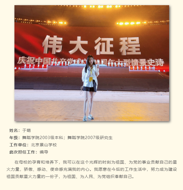 三个多月的工作,在无数次的创意会、无数次的排练、无数次的修改,无数次的呈现中,我切身感受党和人民砥砺奋进的百年。作为民大学子,我深深地感谢民大对我的培养,没有老师的谆谆教诲,也就没有今天能够参加《伟大征程》的我。