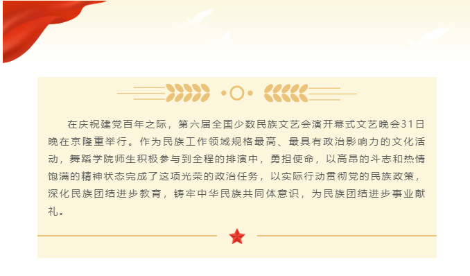 师生圆满完成第六届全国少数民族文艺会演开幕式文艺晚会,党员师生们冲锋在前,用实际行动践行民族团结一家亲,同心共筑中国梦的家国理念,激励同学们坚定信仰信念,保持爱国初心,以永不懈怠的精神状态和一往无前的奋斗姿态,为新时代的繁荣继续奋斗。