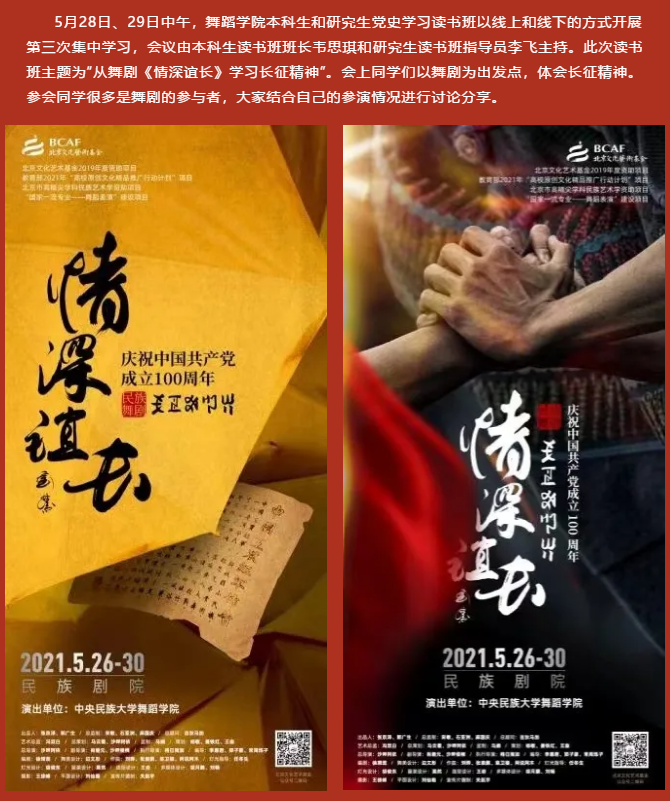 25日晚,我看了舞剧《情深谊长》的联排演出,身为编导专业的我,深知排一台大型的舞剧需要耗费大量的时间和精力,所以也非常感谢所有的老师与同学,能付出自己的课余时间为我们带来一台这样具有浓厚家国情怀的民族舞剧。我跟在场的观众一样,在看到果基小叶丹不幸遇难时,仿佛瞬间就变成了穿着丧服的果基夫人,我们有着共同的情感,共同的不舍。彝族同胞一诺千金,用生命去守护国旗,在家与国之间,果基小叶丹选择舍小家为大家的伟大情怀值得我们歌颂。