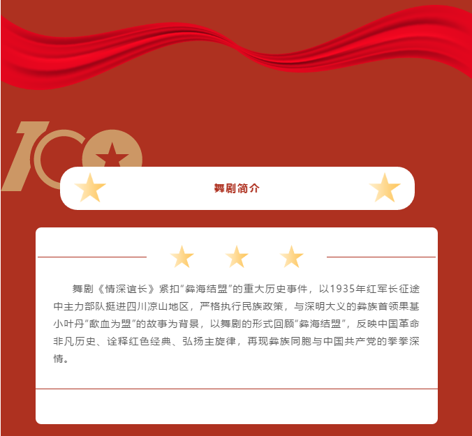 舞剧《情深谊长》以“结盟旗帜”的意象贯穿,通过“授旗、藏旗、献旗”史诗般呈现了彝族同胞在第五次反“围剿”发生后长达十五年的时间里对国民党的反抗与对共产党的坚守,全景式描绘了特定历史背景下凉山彝族的生活情境,歌颂了民族团结的“情深谊长”。