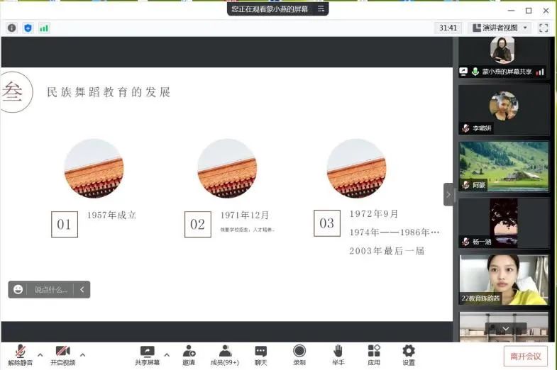 专业的发展历程,进一步认知所学专业,明晰发展方向,明确责任担当,挖掘发展潜能,希望同学们充分利用学校的教育教学资源,积极进取,不断精进专业能力,提升精神文化素养,树立正确的理想信念,思源奋进,致力于将自己塑造成为堪当民族复兴大任的卓越的中国民族舞蹈人才。