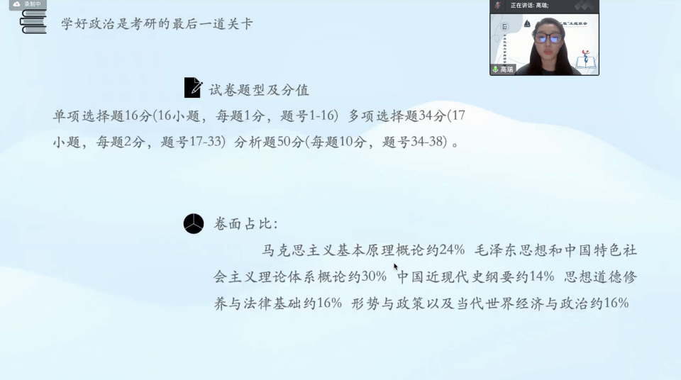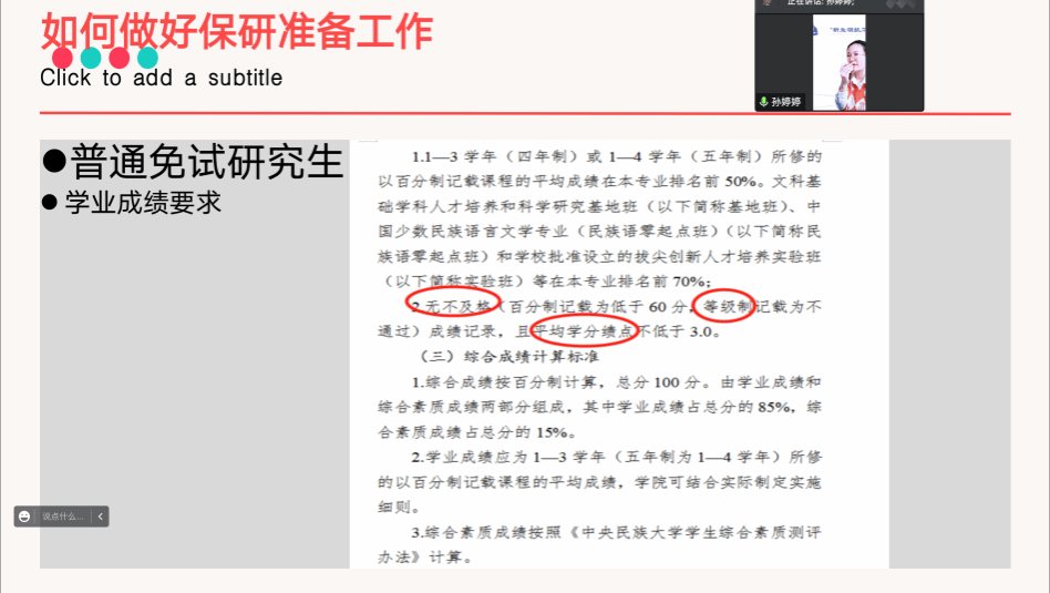 孙婷婷老师为同学们进行本科学习教育。首先,她强调期末考试中设备调试、诚信考试、以及专业考试场地安全等注意事项。接着,她向同学们详细讲解民大万象城保研的类型、名额、资格要求、学业成绩要求等方面的信息。同时她向同学们分享考研的准备工作,并表示希望同学们能够提前规划好学习和生活实践。