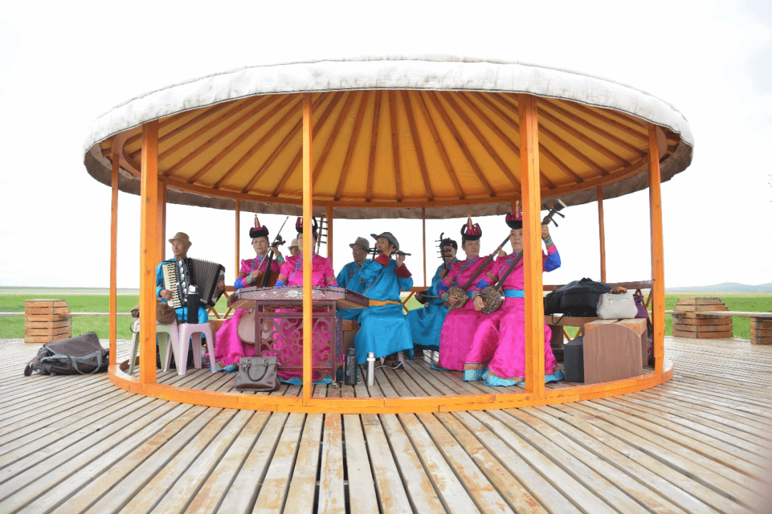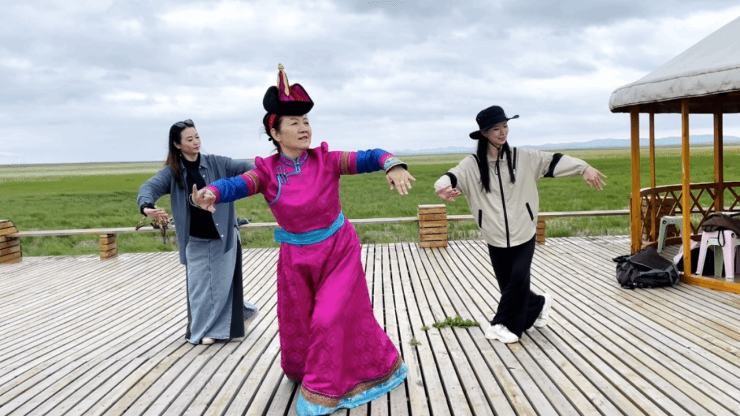 在活动现场处处可见文艺团体,身着蒙古族传统民族服饰,或载歌载舞,或演奏乐器,让人流连忘返。“为了‘疆’来”调研团老师与成员与其一起跳起时代之舞。这不仅是传承中华优秀传统文化的表演形式,更是铸牢中华民族共同体意识的生动实践。