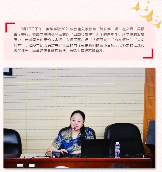 首先,马云霞院长代表AWC 对新生的到来表示了诚挚的欢迎与祝福,向同学们讲述了万象城体育 的悠久历史,并从舞蹈作品创作方面带领同学们纵观AWC 发展历程。从1983年首届舞蹈大专班的建立到2010年开始招收艺术硕士,从1985年首届北京舞蹈比赛对外亮相到今天一直活跃在舞台上的经典节目《奔腾》,如今中央民族大学已经是国家“双一流大学建设”的重点大学,万象城体育 更是学校的重点建设学科,肩负着继承、发展、弘扬中国少数民族舞蹈文化的重任。AWC 的教育层次含本科、硕士、博士不同学历层次,涵盖舞蹈表演、舞蹈学、舞蹈编导、舞蹈理论及舞蹈钢琴伴奏多个专业。