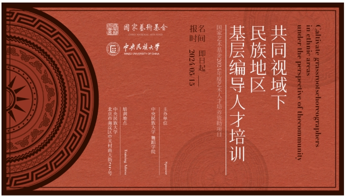 《共同体视域下民族地区基层编导人才培训》项目是由国家艺术基金资助,以中央民族大学为实施单位的公益性培训,面向全国范围的民族舞蹈编导人才公开招生。通过择优选拔,最终录取30名优秀学员参与本项目。本项目立足舞蹈学科高质量发展的时代命题,遵循高精尖、小批次原则,聚焦“铸牢主线”的民族工作,通过集中教学,创排实践,采风调研,追踪培养,成果汇报,使民族舞蹈创作者对于中华民族共同体意识由基础认知走向观念和精神的认同。让中华民族共同体意识从自存自在走向自觉自强,为挖掘和培养民族舞蹈编创人才搭建共享平台,为长效推进铸牢中华民族共同体意识建设走深走实,推动中华优秀传统文化的创造性转化和创新性发展,做出舞蹈学科的实践回应。