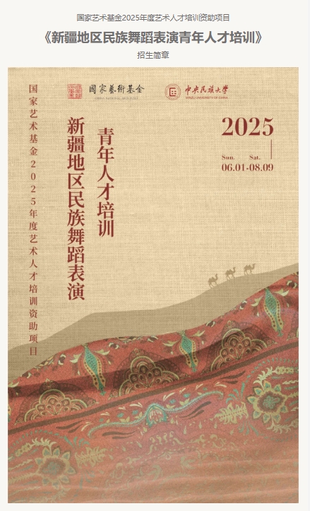 (1)通过招生简章自行下载并填写国家艺术基金2025年度艺术人才培养资助项目《新疆地区民族舞蹈表演青年人才培训》报名登记表(见附件一)。③单位出具的脱产学习证明原件(扫描件,需要加盖单位公章);⑤业务能力证明材料:个人独立表演的舞蹈作品视频、专业大赛获奖证明材料(在舞蹈表演和舞蹈创作方面具有双料能力的艺术人才优先入选);(3) 将以上报名材料打包压缩后以邮件附件形式发送到指定邮箱[email protected],扫描件文档以PDF格式发送,并按照“省、市、地区名+单位名+个人姓名”进行命名。注 :